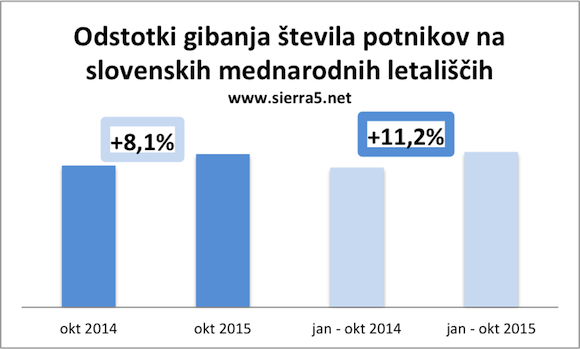 Na letni ravni pa je bilo v prvih desetih mesecih na Aerodromu Ljubljana, Aerodromu Maribor in Aerodromu Portorož za 11,2 odstotka več potnikov kot v enakem opazovanem obdobju v letu 2014.