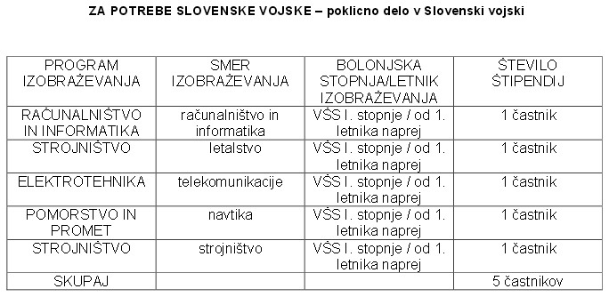 Ministrstvo za obrambo Republike Slovenije objavlja Javni natečaj za podelitev štipendije za častnike izobraževalnih programov pomorstva in prometa, strojništva, računalništva in informatike in elektrotehnike za poklicno delo v Slovenski vojski za šolsko leto 2017/2018.