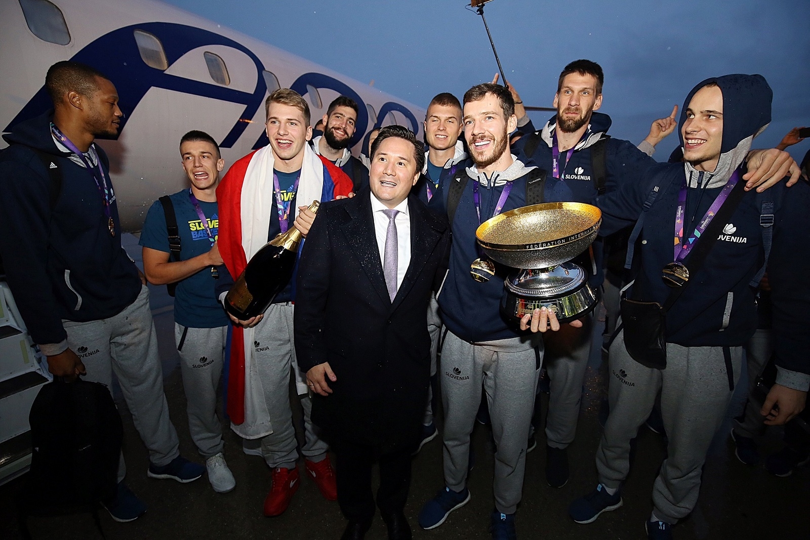 »Hvala vam, da ste poleg mene in mojih sodelavcev navdihnili vse državljane in državljanke Slovenije. Resnično ste se pokazali kot veliki ambasadorji države. V imenu Adrie Airways vam povem, da nam je bilo to, da smo vas lahko pripeljali nazaj domov, v velik privilegij in zadovoljstvo,« je s ponosom dejal nepremagljivi dvanajsterici. »V primerjavi s tem, kar smo lahko videli včeraj, lahko rečem, da mi je bilo kot dolgoletnemu košarkarskemu navijaču spremljanje zadnjega finala ameriške lige NBA dolgočasno. Navdušen sem bil nad vašo izjemno igro in fenomenalnim timskim nastopom,« je še dodal pred genialnim kapetanom Goranom Dragićem in ekipo, ki jih v nadaljevanju večera čaka še veliko proslavljanje zgodovinskega uspeha z navijači in navijačicami z vse Slovenije na Kongresnem trgu v Ljubljani.
