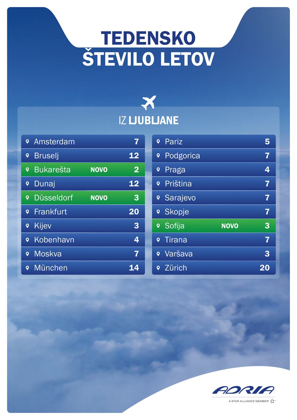 V zimskem voznem redu bo Adria Airways Ljubljano povezovala z dvajsetimi mesti, in sicer z Amsterdamom, Brusljem, Bukarešto (novo*), Dunajem, Düsseldorfom (novo*), Frankfurtom, Kijevom, Kobenhavnom, Moskvo, Münchnom, Parizom, Podgorico, Prago, Prištino, Sarajevom, Skopjem, Sofijo (novo*), Tirano, Varšavo in Zürichom.