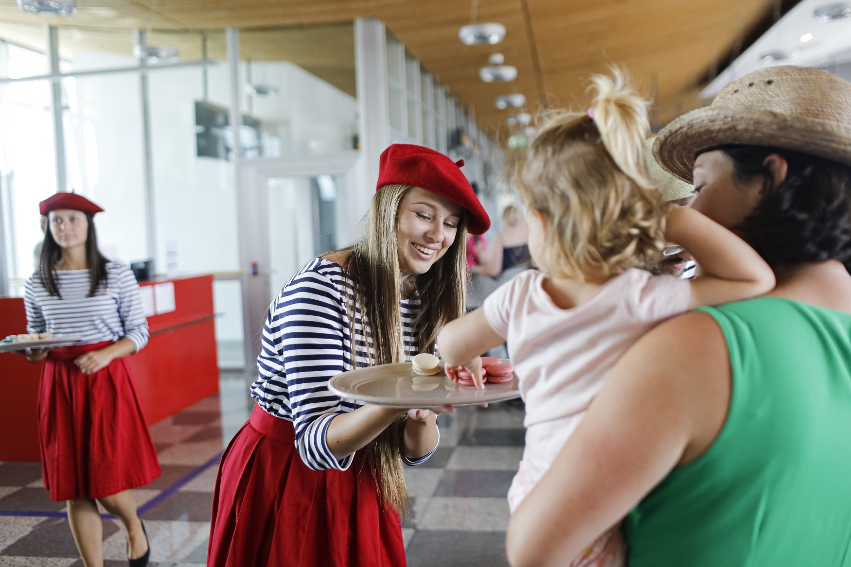 Vsi potniki, ki so včeraj prileteli iz Pariza, ali pa so se tja odpravljali, so bili deležni tudi sladkega presenečenja – posladkali so se lahko z makroni, prestižno francosko sladico.