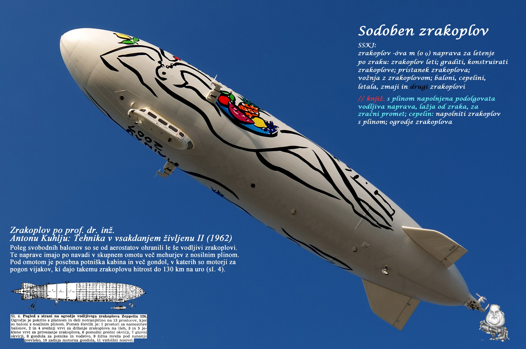 Kot je videti iz podnaslova, gre ost mojega pisanja na neupravičeno in z realnostjo slovenskega jezika skregano rabo imena »zrakoplov« za vse, kar se giblje po zraku. Do leta 1991 se v nobeni knjigi, slikanici ali učnem gradivu v Slovenščini zrakoplov ne omenja kot skupno poimenovanje za zračna prevozna sredstva. To lahko preverite v vsaki mestni knjižnici, ki še hrani literaturo iz preteklosti. V tistem času so opisovali letala vseh vrst, helikopterje, balone in zrakoplove. Torej je zrakoplov zasedal častno mesto po definiciji, ki jo je pokojni univ. prof. dr. inž. Anton Kuhelj opisal v leta 1962 pri Mohorjevi družbi izdani knjigi Tehnika v vsakdanjem življenju II: »Poleg svobodnih balonov so se od aerostatov ohranili le še vodljivi zrakoplovi. Te naprave imajo po navadi v skupnem omotu več mehurjev z nosilnim plinom. Pod omotom je posebna potniška kabina in več gondol, v katerih so motorji za pogon vijakov, ki dajo takemu zrakoplovu hitrost do 130 km na uro. Čeprav se more gibati tak zrakoplov v vsaki smeri in ni kakor svobodni balon izročen vetI1ovom na milost in nemilost, ga danes zaradi razmeroma počasne vožnje in velikih mer uporabljajo le še za zabavo in za iskanje sovražnih podmornic na morjih daleč proč od kopnega, kjer je varen pred napadi nasprotnikovih letal.«