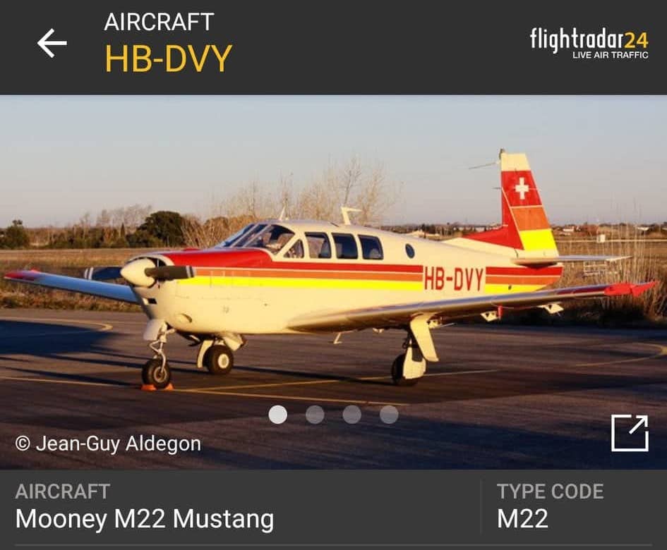 Letalo tipa Mooney M22 Mustang, švicarskih registrskih oznak HB-DVY, je na portoroško letališče priletelo iz Švice. Gre za manjše in starejše enomotorno letalo, ki se večinoma uporablja v zasebne namene in se z njim lahko pelje do 5 oseb. Letal točno tega tipa je bilo po informacijah s spleta narejenih samo 36, prvi polet s tem letalom pa je bil izveden davnega leta 1964, proizvodnja pa je tekla med leti 1965 in 1970. Letalo je zelo priljubljeno med švicarskimi piloti, predvsem zato ker je hitro, ima uvlačljivo podvozje in je zelo ekonomično ter opremljeno s presurizacijskim sistemom, ki omogoča let letala na višini kar 24 tisoč čevljev (7300 metrov). Potovalna hitrost pri 65 odstotni moči motorja je 186 vozlov (344 km/h), maksimalno hitrost pa lahko doseže kar 222 vozlov (412 km/h). Junija 1967 je eno izmed testnih letal opravilo več kot 13 urni neprekinjen polet med New Yorkom in Parizom.