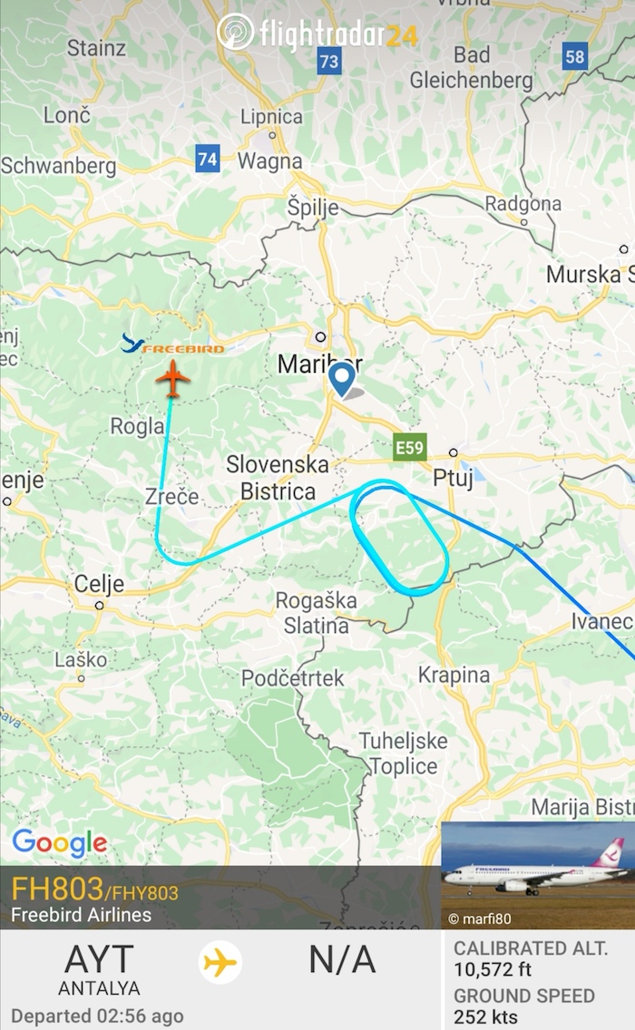 Danes dopoldan je bilo letalo turške letalske družbe Freebird Airlines, Airbus A320, na letu iz Antalije v Maribor, preusmerjeno na alternativno letališče.