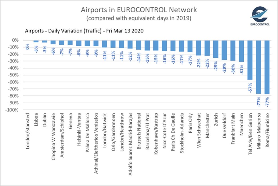 Včeraj je bilo po Evropi izvedenih skoraj 5200 manj letov (-17.3%) kot na primerljiv petek v februarju 2019. Letalski promet na italjanskih letališčih je za 77% nižji, le to občutijo tudi ostala evropska letališča (Munchen -31%, Tel Aviv -57%, Frankfurt -30%, Pariz CDG -16%).