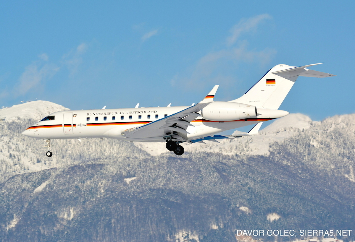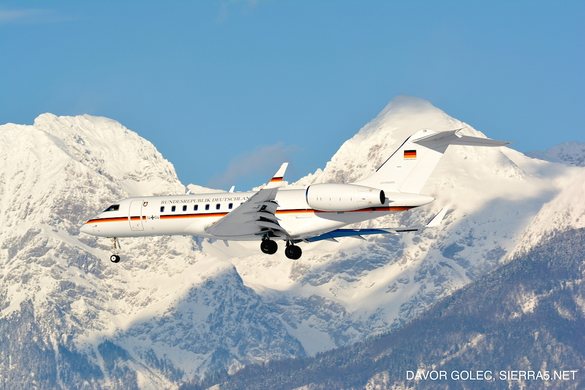 Popestritev zimskega sončnega popoldneva je pred dnevi na ljubljanskem letališču naredilo nemško vladno letalo Bombardier Global 5000 registrskih oznak 14-04.
