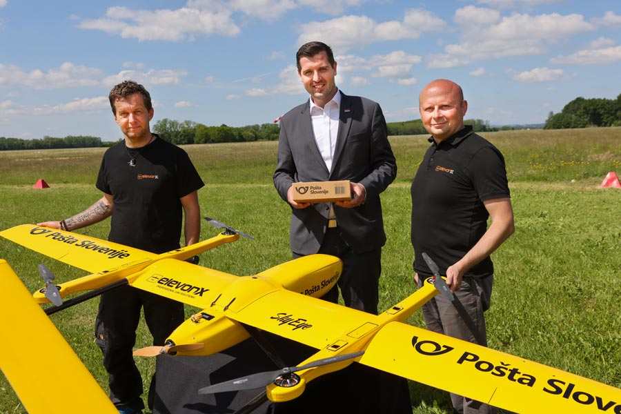 Pošta Slovenije je prvi poskusni let z brezpilotnim letalnikom izvedla v sodelovanju s slovenskim podjetjem OneDrone, ki je prvi slovenski operater brezpilotnih letalnikov najvišje kategorije in omogoča izvajanje letalskih operacij v najzahtevnejših pogojih ter z zagonskim podjetjem ElevonX, ki je proizvajalec brezpilotnih letal (UAV) oziroma celotnih sistemov. Zagonsko podjetje je razvilo modularni brezpilotni sistem ElevonX SkyEye in ga pripeljalo do serijske proizvodnje.