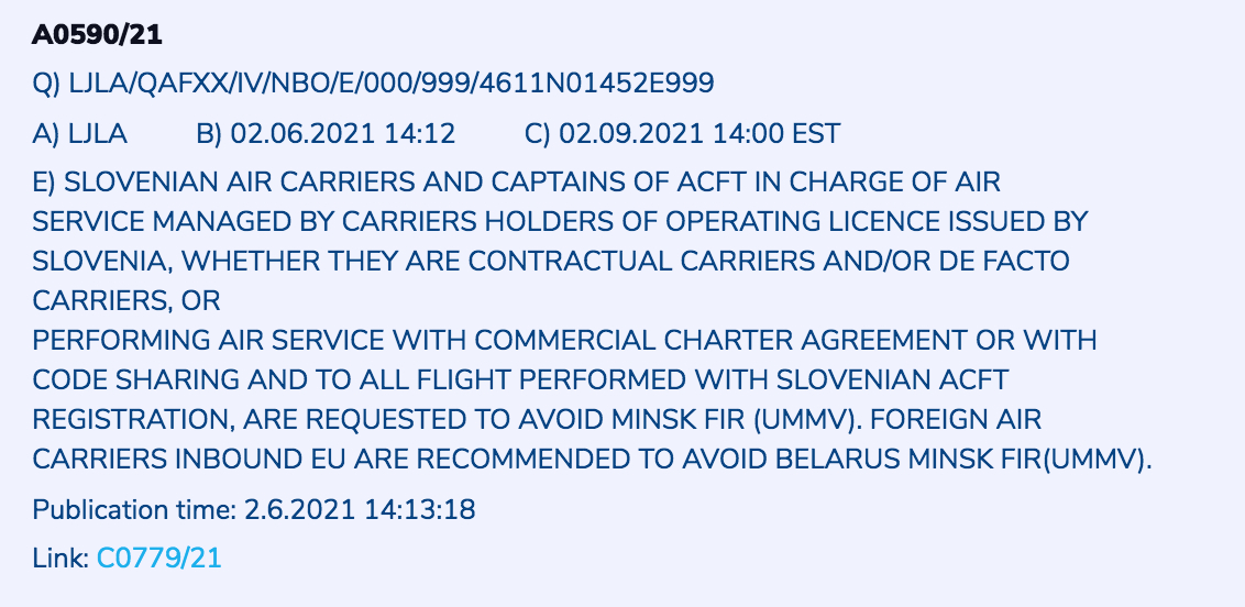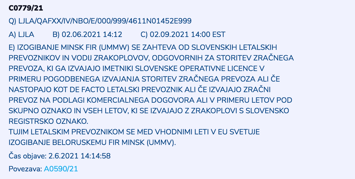Slovenija je z NOTAM sporočilom A0590/21, objavljenim danes popoldan, izdala zahtevo vsem slovenskim letalskim prevoznikom in pilotom zrakoplovov v slovenskem registru zrakoplovov, da se izogibanju beloruskemu zračnemu prostoru MINSK FIR. Tujim letalskim prevoznikom se med vhodnimi leti v Evropsko Unijo svetuje izogibanje omenjenega zračnega prostora.