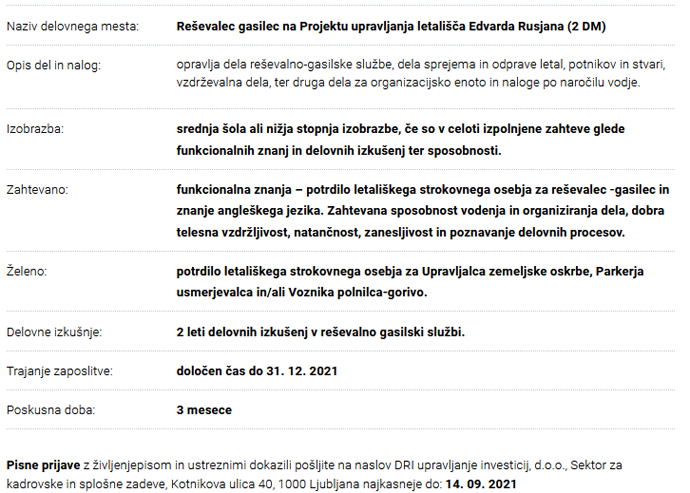 Reševalec gasilec na Projektu upravljanja letališča Edvarda Rusjana (2 DM)