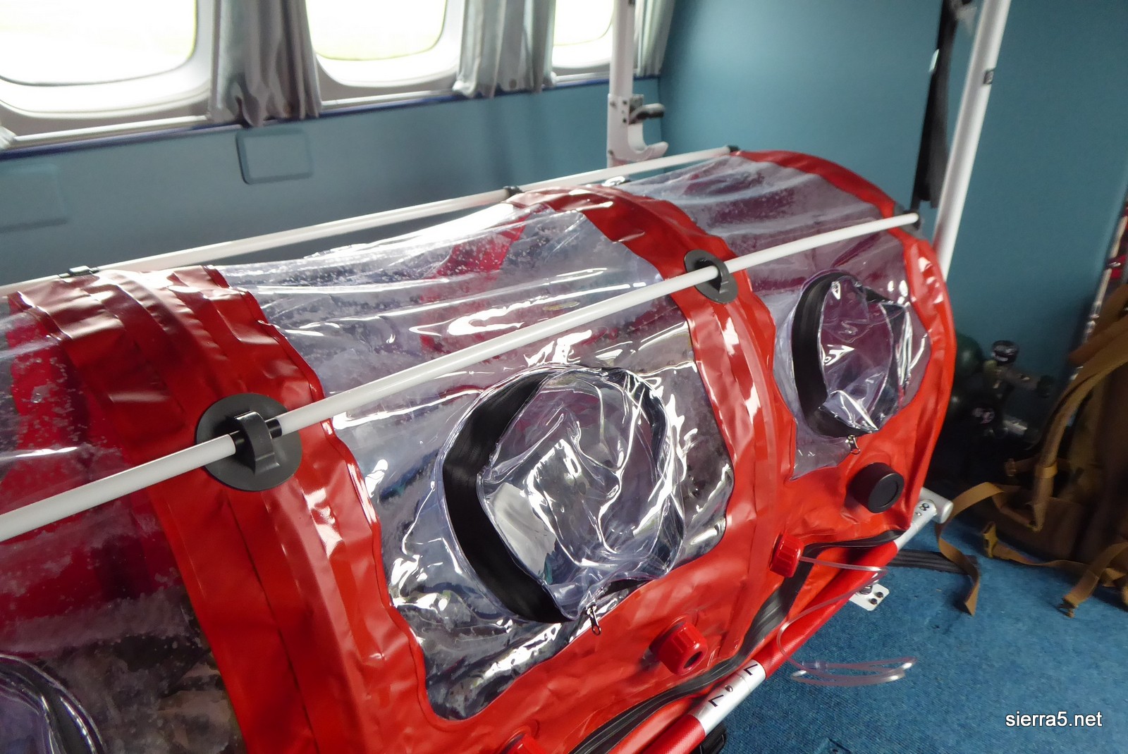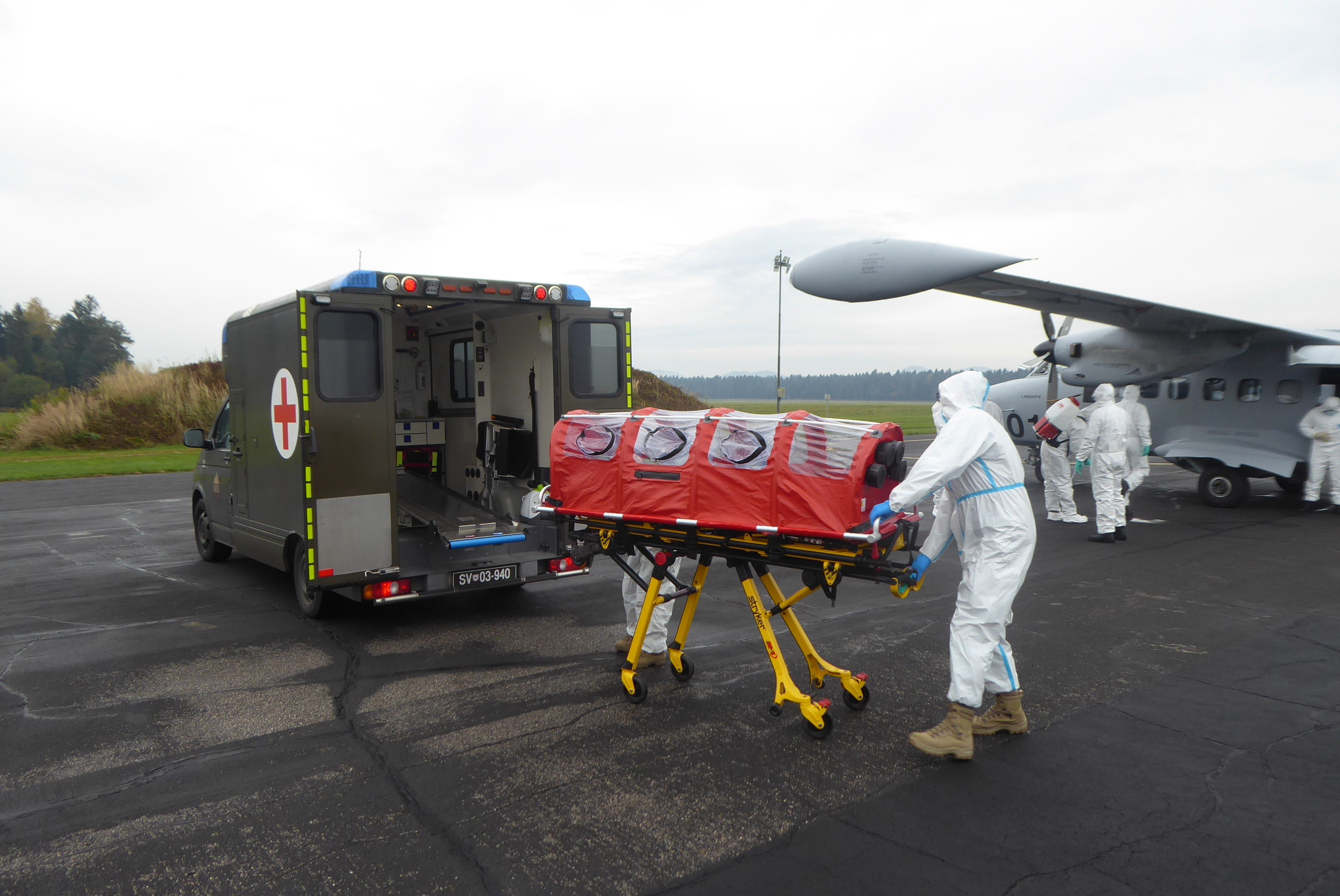 Poleg poškodovanih so na letalo Turbolet L-410 vkrcali tudi bolnika s covidom-19, kar je nalogo prevoza še otežilo. »Od reševalne postaje Univerzitetnega kliničnega centra Ljubljana smo si sposodili transportno vrečo BIO-BAG EBV – 30/40IN-CH, ki omogoča prevoz bolnikov s covidom-19,« je povedal višji vodnik Košak. Biovreča je izdelana iz PVC-folije, tkanine PES, zadrge in podporne strukture iz aluminijevih palic. Uporabljeni tehnološki postopki in posebni neprepustni materiali zagotavljajo varno zatesnjenost notranjega okolja vreče. Na obodu spodnjega dela vreče je nameščena neprepustna zadrga, ki je na vrečo pritrjena s postopkom visokofrekvenčnega varjenja, drsnik pa je nameščen le na eni strani, kar omogoča odpiranje in zapiranje biovreče samo na zunanji strani. Taka zadrga preprečuje morebiten vdor tekočin med postopkom dekontaminacije, ko je v vreči nameščen bolnik, in hkrati omogoča preprosto zapiranje. Nad zadrgo je nameščenih pet zrakotesnih priključkov. Poleg mesta za bolnikovo glavo je nameščen priključek za cev dihalnega aparata oziroma balona za oživljanje. Medicinski konektor je prilagojen tudi za uporabo respiratorja tipa Oxylog. Preostali štirje priključki se uporabljajo za infuzijske cevke, odvodne cevke ali elektrode za elektrokardiograf.