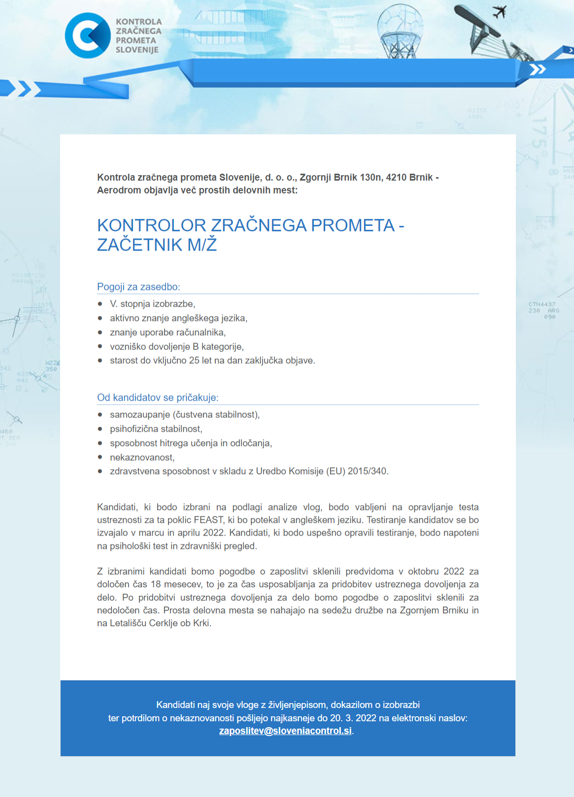 Kontrola zračnega prometa Slovenije objavlja več prostih delovnih mest: kontrolor zračnega prometa - začetnik m/ž