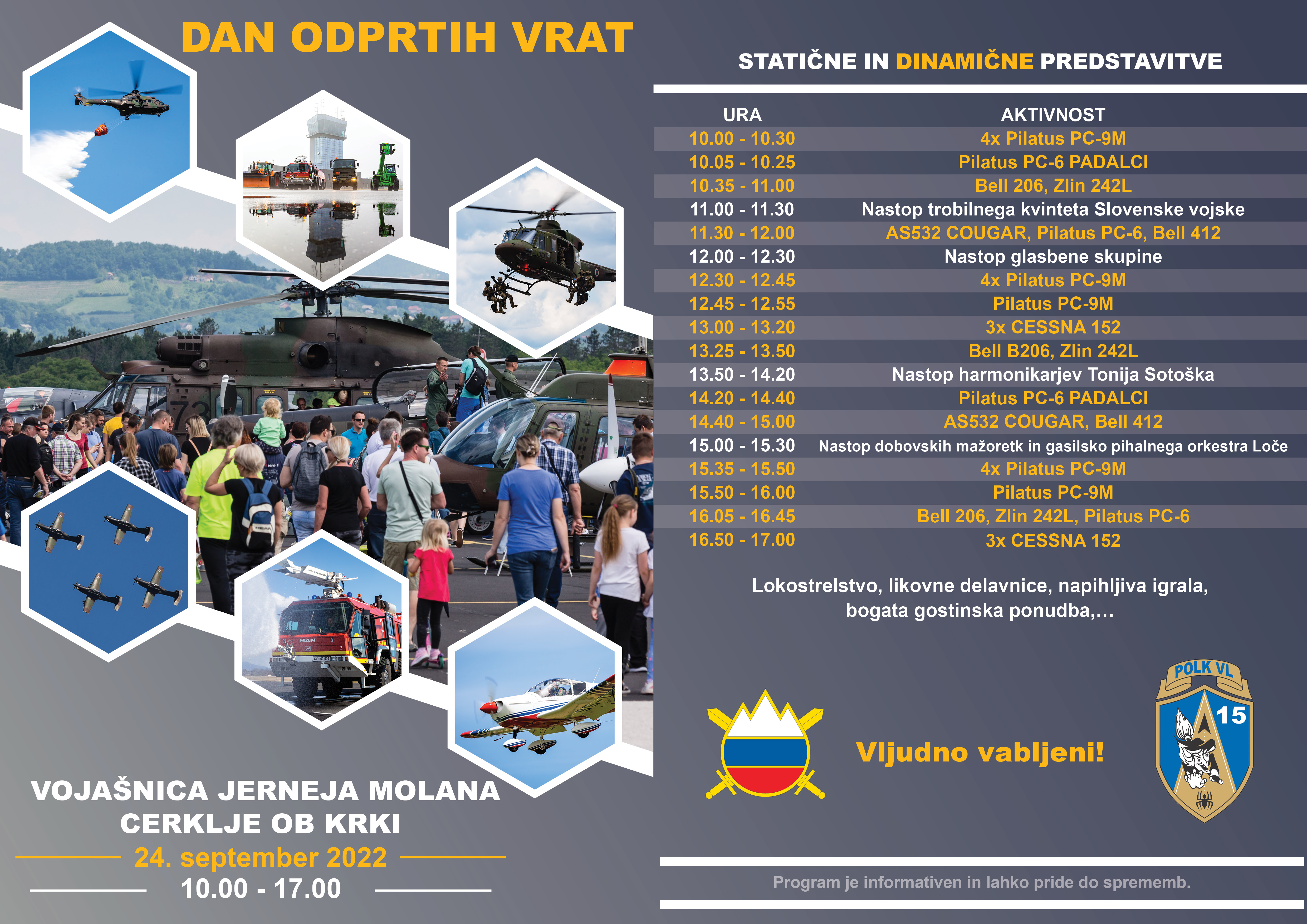 V soboto, 24. septembra, bo med 10. in 17. uro svoja vrata odprla Vojašnica Jerneja Molana v Cerkljah ob Krki, kjer si boste lahko ogledali opremo in oborožitev, statične in dinamične predstavitve letal in helikopterjev Slovenske vojske in nekaterih letalskih klubov.