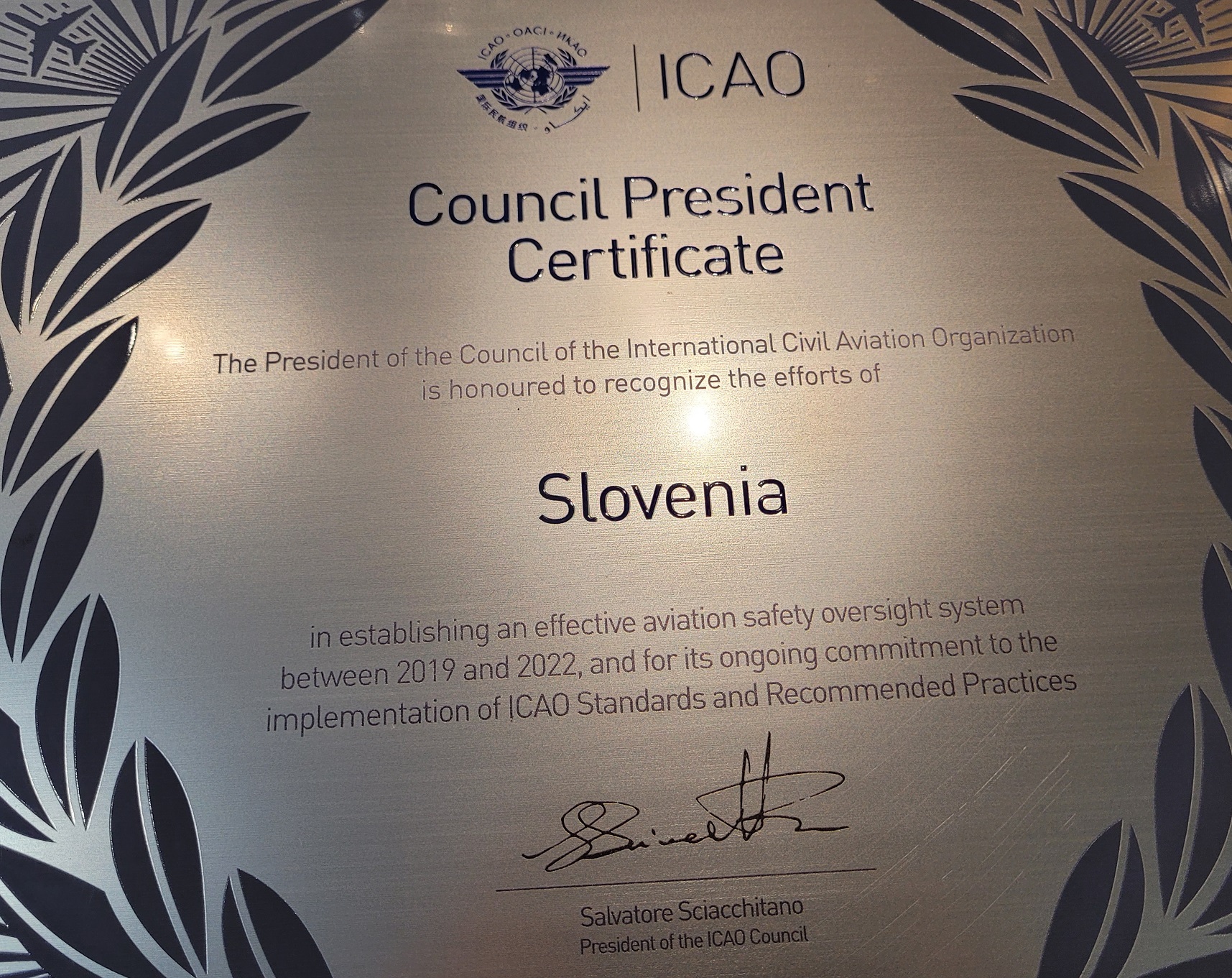 »Slovenija je v zadnjih letih naredila velik napredek pri vzpostavitvi učinkovitega sistema nadzora letalske varnosti in izboljšala učinkovito implementacijo standardov in priporočenih praks ICAO. Zaradi tega je Slovenija na skupščini ICAO v Montrealu, dobila Priznanje "ICAO Council President Certificate in Aviation Safety". Priznanje smo sprejeli zaradi izboljšanja kazalcev doseganja letalske varnosti, kar je rezultat temeljitega pregleda ICAO sicer še v času pred epidemijo.« je povedal Srečko Janša, generalni direktor, Direktorat za letalski in pomorski promet, Ministrstva za infrastrukturo in dodal, da z delom še niso zaključili, saj da gre za kontinuiran proces. Veliko dela bo moralo biti vloženega še na področjih reguliranja letališč in preiskovanja letalskih nesreč. »Tako je naslednji izziv ureditev pravnih podlag, s katerimi se bodo podale tehnične in organizacijske zahteve za vsa slovenska letališča, ki niso regulirana s predpisi EU. Edino slovensko mednarodno letališče, ki ima certifikat v skladu s pravom EU je ljubljansko. Z novim predpisom bomo odpravili neskladja, ki jih je ugotovil ICAO in se nanašajo na certificiranje tistih mednarodnih letališč, za katera se ne uporabljajo predpisi EU, in tudi vseh drugih letališč.« je sklenil Janša.