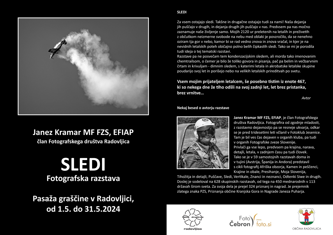 Naša dejanja jih puščajo v drugih, in dejanja drugih jih puščajo v nas. Predvsem pa nas močno zaznamuje naše življenje samo. Mojih 2120 ur preletenih na letalih in preživetih z občutkom neizmerne svobode na nebu med oblaki, je povzročilo da se nenehno oziram tja gor v nebo, kamor bi se rad vedno znova in znova vračal, in kjer je na nevidnih letalskih poteh običajno polno belih čipkastih sledi. Tako se mi je porodila tudi ideja o tej tematski razstavi.