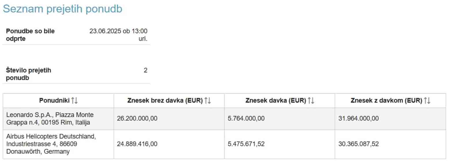 Rok za oddajo ponudb je bil določen do 23. junija 2025 do 9. ure, ob 13. uri pa je sledilo javno odpiranje ponudb. Iz portala javnih naročil je razvidno, da so prišli dve ponudbi.