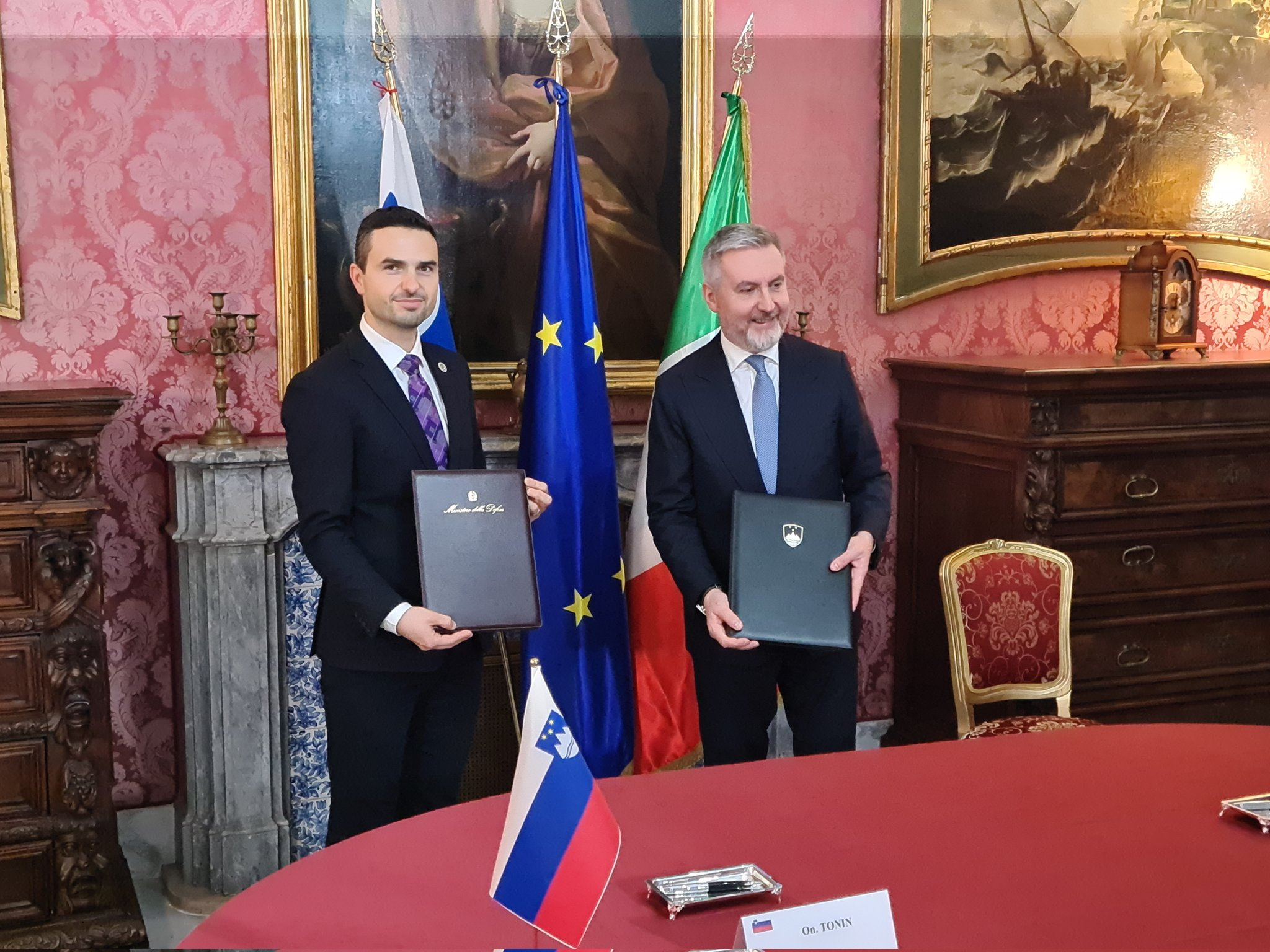 Minister za obrambo Republike Slovenije mag. Matej Tonin se je na vabilo italijanskega kolega Lorenza Guerinija danes mudil na delovnem obisku v Rimu. V okviru srečanja sta ministra podpisala dogovor o sodelovanju med ministrstvoma za obrambo Italijanske republike in Republike Slovenije o sodelovanju na področju letalstva, katerega temelj je transportno letalo C-27J Spartan.