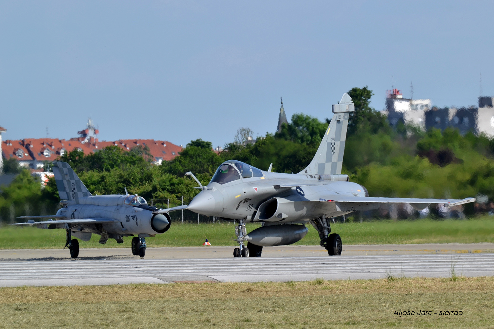 Zatem je sledil najbolj pričakovana točka dneva. Enosedi Rafale(150) in MiG-21bis (116), sta se počasi pripeljala mimo publike po vozni stezi. Rafale je imel pod trupom nameščen pomožni rezervoar, medtem ko je bil MiG, z repno poslikavo ob 25. obletnici hrvaškega vojaškega letalstva, v t.i. “čisti konfiguraciji”. Rafale je vzletel prvi, kmalu zatem mu je sledil še MiG, oba pa sta stezo zapustila s pomočjo dodatnega izgorevanja. Letali sta izvedli več manevrov pred publiko, od nizkih preletov do sodčkov, nato pa sta se združilivi v foramcijo in tako preleteli vzletno pristajalno stezo ob spremljavi pesmi Rim Tim Tagi Dim, s katero je hrvaški pevec Baby Lasagna nastopal na sobotnem finalu Evrovizije. Kmalu zatem je MiG pristal z uporabo zaviralnega padala. Pilot Rafala je medtem izvedel še zadnji nizki prelet pred pristankom.