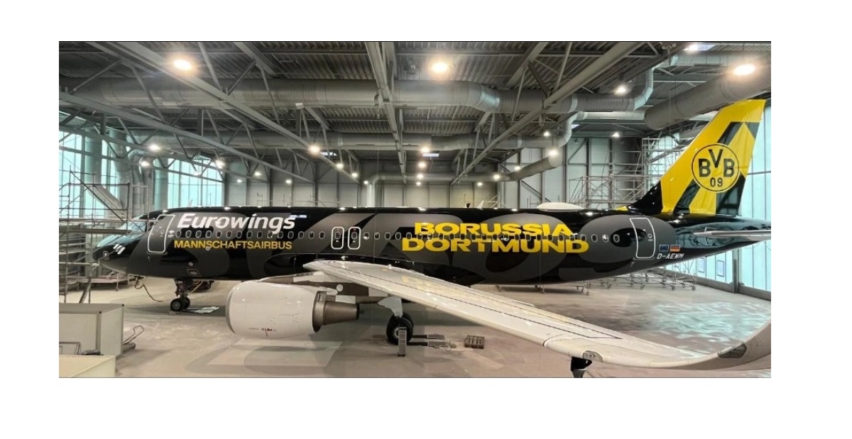 Letalo družbe Eurowings Airbus A320-214 reg. D-AEWM je bilo pobarvano v ikonične barve nogometnega moštva Borussia Dortmund v hangarju v Münstru.